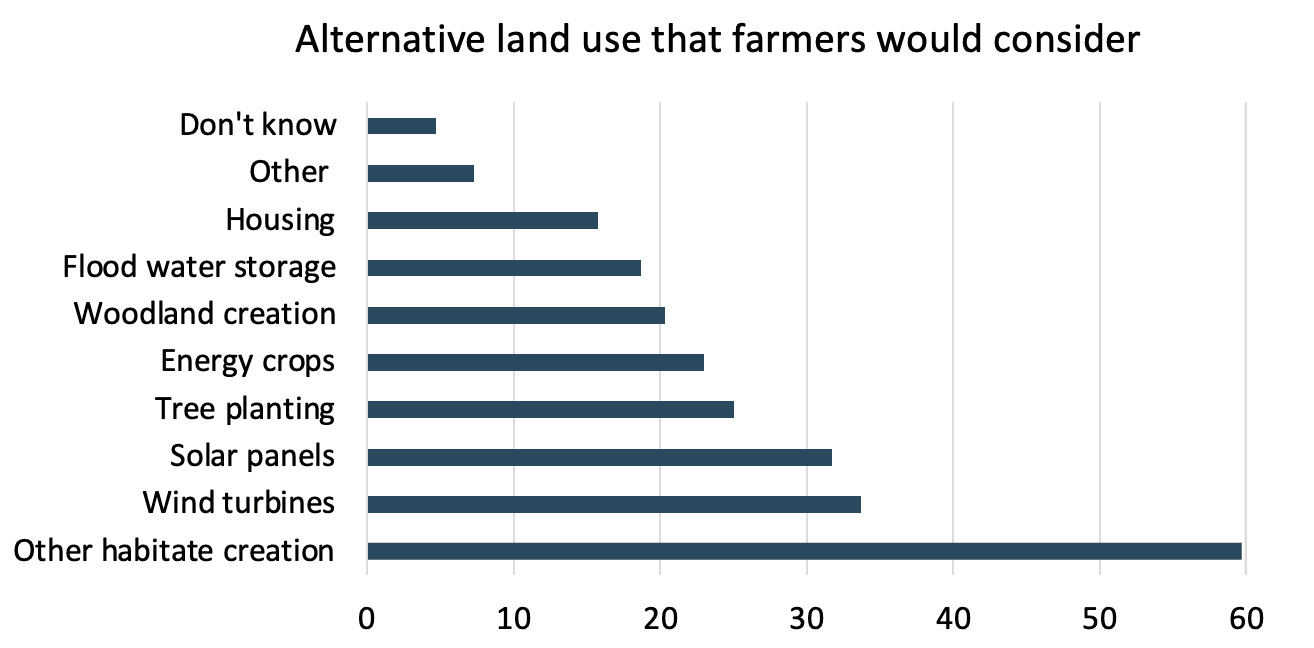 Figure above: In response to the survey question: “Would you consider using some of your farmland for one or more of the following, given the right incentives? Select up to three.”